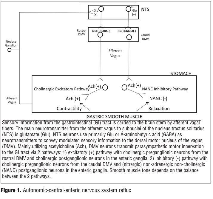 More specifically, visceral sensory information from the stomach is transmitted through the afferent vagus into the brainstem via a glutamatergic synapse at the level of the nucleus of the tractus solitarius (NTS). NTS neurons project to, among other areas, the adjacent dorsal motor nucleus of the vagus (DMV) using mainly gamma-aminobutyric acid (GABA), glutamate, and catecholamines as neurotransmitters. Interestingly, there appears to be a spatial organization of vagal preganglionic (parasympathetic) neurons in the DMV. The rostral DMV preferentially innervates a cholinergic excitatory pathway responsible for gastric contraction while caudal DMV neurons are efferent to an inhibitory pathway responsible for gastric relaxation. Dorsal motor nucleus of the vagus neurons are, a priori, cholinergic and innervate postganglionic neurons located within the stomach. In the stomach, postganglionic parasympathetic neurons form two distinct pathways: 1) an excitatory cholinergic pathway that increases gastric tone, motility and secretion via activation of muscarinic cholinergic receptors and 2) an inhibitory nonadrenergic, non-cholinergic (NANC) pathway that inhibits gastric functions via release of predominantly nitric oxide (NO) or vasoactive intestinal polypeptide (VIP). Ultimately, gastric tone represents a balance between the excitatory cholinergic and the inhibitory NANC pathways. For example, gastric functions may be inhibited, i.e., decreased motility/delayed gastric emptying, either by activation of the NANC pathway or by inhibition of the tonic cholinergic pathway (Figure 1).[12]