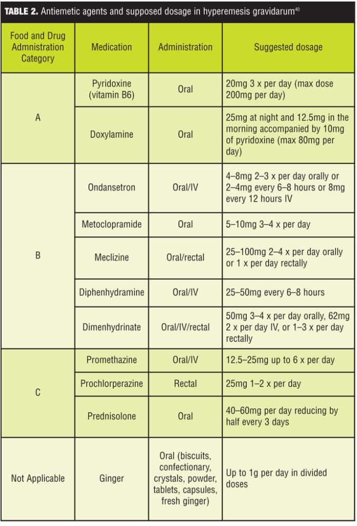 As for the “target symptoms” of nausea and vomiting, a recent Cochrane review found a lack of high-quality evidence to back up any advice on which interventions to use.[28] The American College of Obstetricians and Gynecologists (ACOG) has published an algorithm for the management of nausea and vomiting in pregnancy.[29] The ACOG currently recommends that a combination of oral pyridoxine hydrochloride (vitamin B6) and doxylamine succinate be used as first-line treatment for HG, if pyridoxine monotherapy does not relieve symptoms. Pyridoxine is a water soluble vitamin that is involved in the metabolism of amino acids, lipids, and carbohydrates. Doxylamine directly inhibits the action of histamine at the H1-receptor, acts indirectly at the vestibular system, and exhibits some inhibition of muscarinic receptors to decrease stimulation of the vomiting center. If the patient has a higher BMI, she may take up to 8 to 12 tablets a day without increasing maternal adverse effects, fetal risk, degree of tiredness, and birth defects. These higher doses appear to be more efficacious.[30]