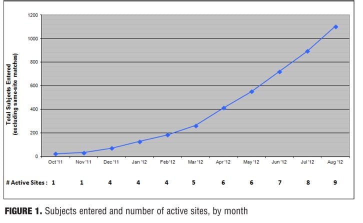 Results were obtained by searching the database for number of subjects entered, number and type of matches and number of active sites using the database during any given month. In addition, anecdotal information was captured regarding patient and site attitudes toward participating in the database project.