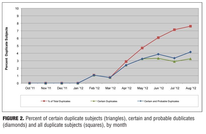 Duplicate and professional subjects are a significant problem in clinical trials and likely contribute to failed central nervous system (CNS) studies.[1] Evident wherever there is a high density of study sites, duplicate subjects have been reported in California, Florida, Pennsylvania, New York, and several other states.[2,3]