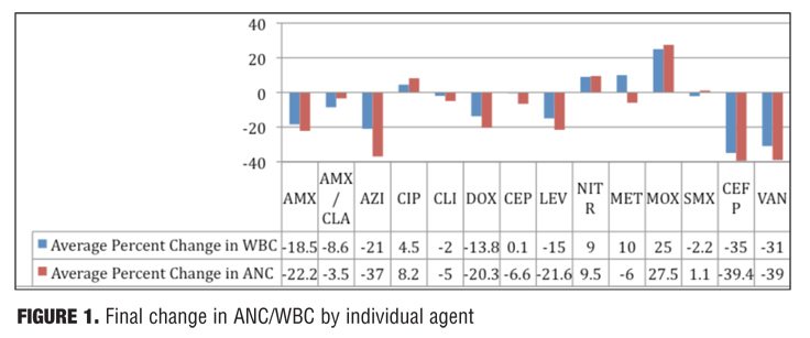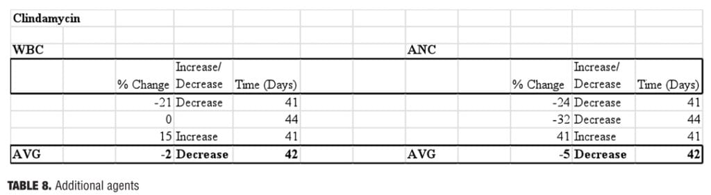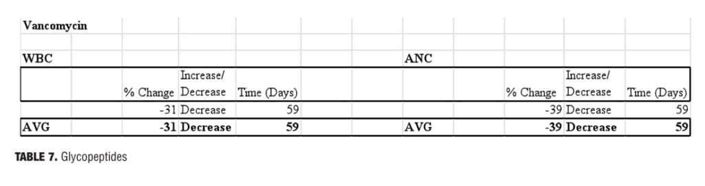 The authors enrolled one patient who was prescribed vancomycin within the past year. Reductions in ANC and WBC at 50 days postantibiotic discontinuation were 39 percent and 31 percent, respectively. Our study found that patients prescribed clindamycin, metronidazole, or nitrofurantoin were found to have ANC/WBC values that returned within 10 percent of baseline after discontinuation of the antibiotic agent. The relevance of our data is limited, however, by the limited use of these agents within our facility.