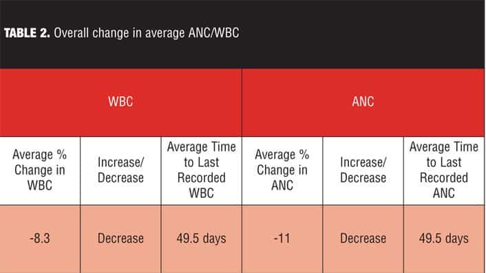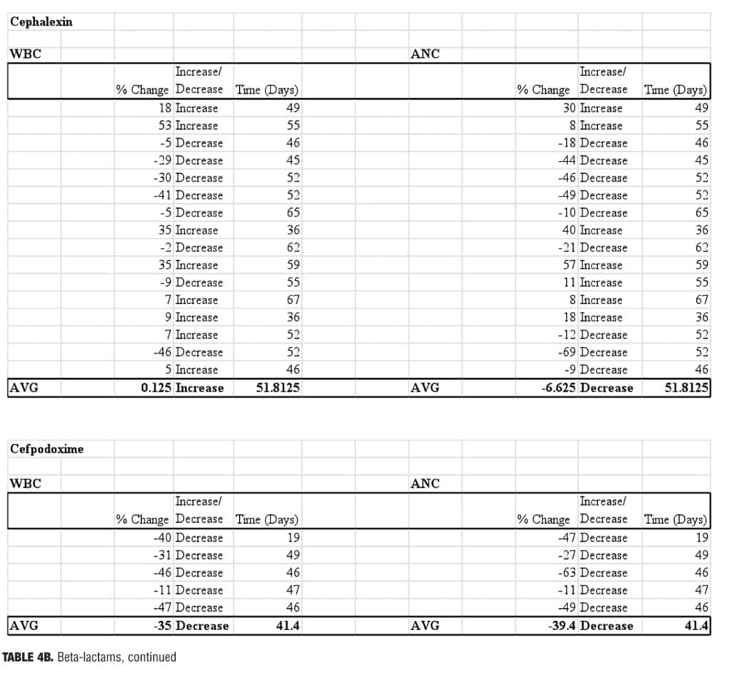 Surprisingly, our study found that cephalexin (n=16) did not result in the substantial ANC or WBC reductions seen with cefpodoxime. On average, ANC remained 6.6 percent below baseline at 52 days after the antibiotic regimen was completed (range -69 to +57%), while WBC essentially returned to baseline (average 0.1% increase, range: -46 to +53%).
