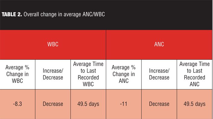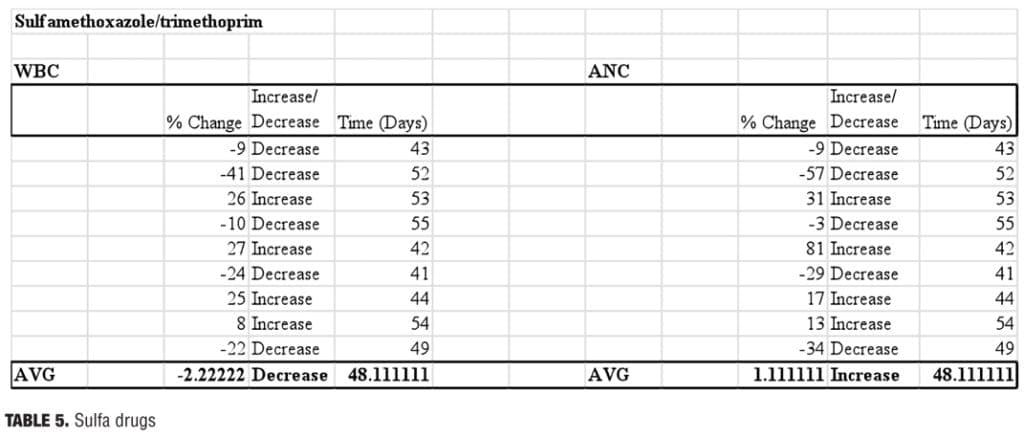 Our data showed that patients prescribed sulfamethoxazole/ trimethoprim (n=9) experienced minimal change from baseline. At 48 days postantibiotic, ANC values had returned to previous levels (average 1.1% decrease, range -57 to +81%). Changes in WBC counts were also similar to baseline (average 2.2% increase, range -41 to +27%). As with other classes of antibiotics, the changes in ANC/WBC varied to a great extent.