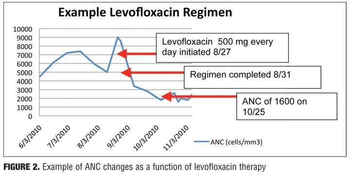 -50 to +88%) and a 4.5-percent increase in WBC (range: -32 to +56%). Levofloxacin, however, produced net decreases in ANC and WBC, which persisted upon discontinuation (Figure 2). The average ANC was found to be 15 percent decreased from baseline (range: -70 to +32%) while the average reduction in WBC was 22 percent (range: -53 to +32%).
