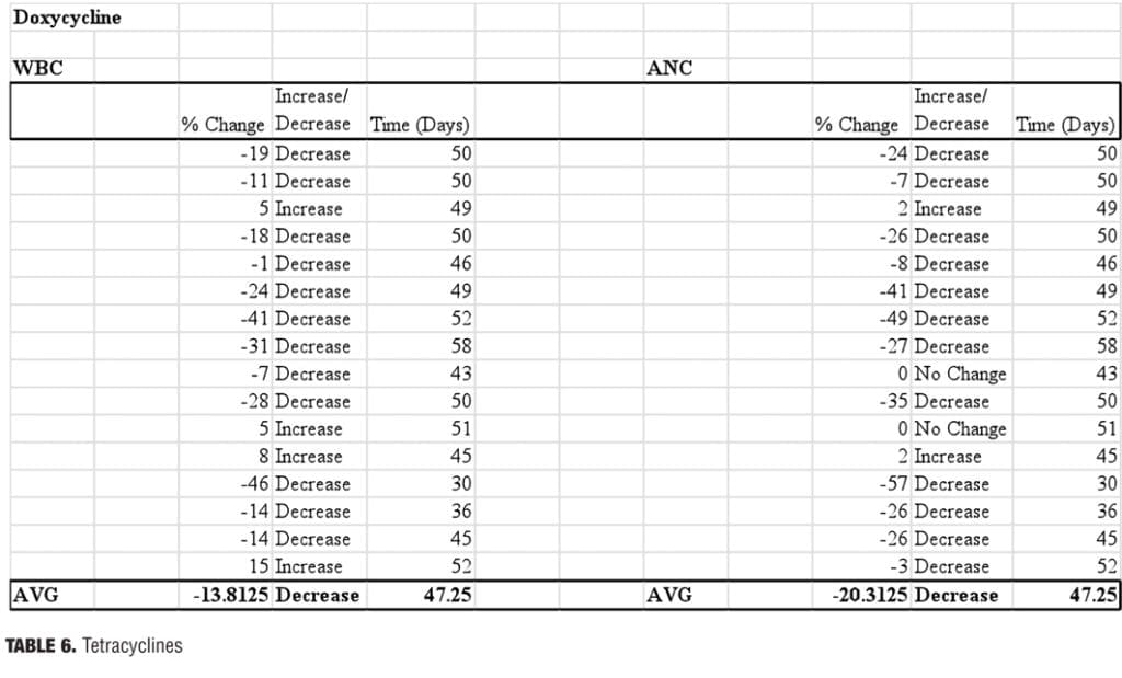 Doxycycline. Doxycycline may also have a role in facilitation of hematologic changes through the inhibition of matrix metalloproteinases (MMPs), which are important mediators of cytokine release and subsequent cellular development. Upon suppression of bone marrow, MMP-9 expression is up-regulated. Mice deficient in MMP-9 had, on average, an eight-day delay in the recovery of WBCs from dyscrasias induced by the cytotoxic agent 5-fluorouracil (5-FU).[35] Doxycycline has been shown to inhibit MMP-9 and prolong neutropenic episodes induced by 5-FU therapy.[36] Our findings indicate a delay in recovery of ANC and WBC, with reductions in both ANC and WBC noted at 47 days after the antibiotic regimen was completed. While the number of individuals prescribed doxycycline regimens (n=16) was larger than with other types of antibiotics, there remained a degree of variance between baseline and final hematologic parameters. While the average reduction in ANC was 20.3 percent (range: -57 to +2%), the corresponding decline in WBC was only 13.8 percent (range: -46 to +15%).