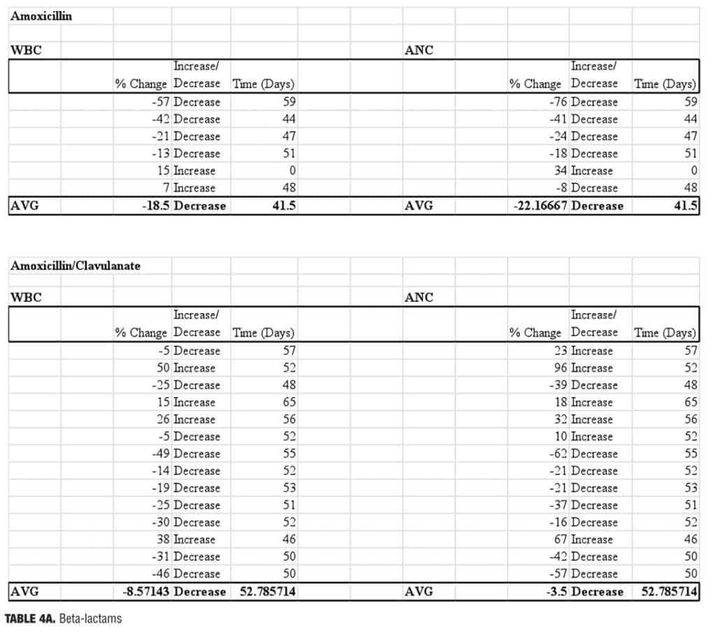 Four beta-lactam antibiotics were included in this study: two penicillins and two cephalosporins. As expected, individuals prescribed the cephalosporin agent cefpodoxime (n=5) displayed the greatest reductions of any beta-lactam agent. There was an average 39-percent decrease in ANC (range: -63 to -11%) and a 35-percent decrease in WBC (range: -47 to -11%) when compared to baseline. Amoxicillin (n=6) was also associated with profound changes; average ANC was found to be reduced by 22 percent (range: -76 to +34%) while WBC decreased by 18.5 percent (range: -57 to +7%) amoxicillin/clavulanate (n=14), however, did not result in major changes 50 days-post discontinuation. The ANC was found to be reduced by 3.5 percent on average (range: -62 to +96%), while the WBC decreased 8.6 percent (range: -49 to +50%). It is possible that the beta-lactamase inhibitor clavulanate may have a role in suppressing some of the negative effects on ANC/WBC produced by amoxicillin. If the process is dependent on the potency of the antibiotic used, then differences may also be explained by the varying doses within the specific agent used. Amoxicillin was given three times daily at either 250mg or 500mg per dose, while the strength of amoxicillin in the combination with clavulanate was 500mg or 875mg dosed twice daily. Our results were not separated by dose of the amoxicillin component. Therefore, it is possible that individuals prescribed amoxicillin received a higher total daily dose as compared to those prescribed amoxicillin/clavulanate.