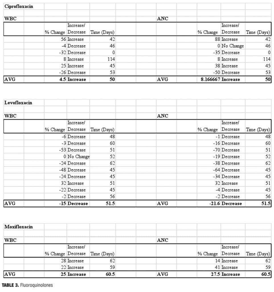 While the fluoroquinolone antibiotics ciprofloxacin and moxifloxacin have been studied in neutropenic patients, no previous studies have evaluated the use of these agents to increase cell counts in clozapine recipients. Three fluoroquinolones were included in our study, and distinct differences in ANC/WBC values were noted within this class. Both patients prescribed moxifloxacin displayed increases in ANC and WBC values (ANC: +14%, +41%; WBC: +22%, +28%), which were sustained at 60 days postcompletion of the antibiotic regimen. Similarly, individuals prescribed ciprofloxacin (n=6) experienced an overall increase in both values. There was an 8.2-percent increase in ANC (range: