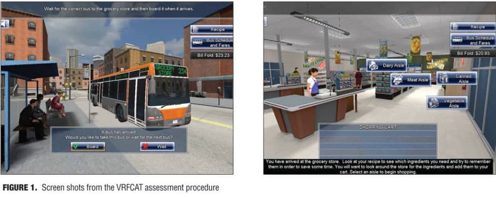 We have developed one such assessment instrument that has the potential for high levels of usefulness for assessment of the ability to meet real-world demands. The Virtual Reality Functional Capacity Assessment Tool (VRFCAT) is a computer-based virtual-reality measure of functional capacity that relies on a realistic simulated environment to recreate routine activities of daily living. The VRFCAT’s realistic, interactive and immersive environment consists of a tutorial and six versions of four mini scenarios, which include navigating a kitchen, catching a bus to a grocery store, finding/purchasing food in a grocery store, and returning home on a bus. Participants complete the scenarios through a progressive storyboard design. The VRFCAT is very relevant as an assessment of everyday functional capacity. Data covering 12 measures of accuracy and timing are collected and automatically downloaded, and factor scores are created to enhance data reduction, detection of impairments, and sensitivity to treatment. Early work using the VRFCAT with healthy elderly people and patients with severe mental illness8 suggests that it has very good psychometric properties, such as good reliability and concurrent validity with conventional non-VR functional capacity assessments and cognitive outcomes. Current work funded in part by National Institute of Health (NIH) focuses on the ability of the VRFCAT to be sensitive to treatment-related change and age-related decline in functional skill.