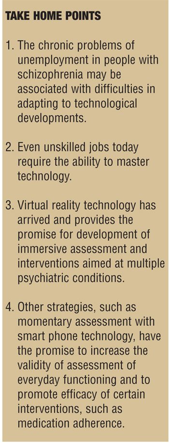 In summary, while technology represents a significant challenge to people with severe mental illness, there are exciting recent developments that utilize technology to increase the validity of assessment of functioning and have the potential to lead to new treatments. Virtual reality seems to have a place for both assessment and treatment and the promise of remote delivery could increase the efficiency of interventions for underserved populations.
